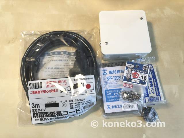 そこで、雨風に耐えられる、エルパ ( ELPA ) 防雨延長コード CP-BE03を用意しました。